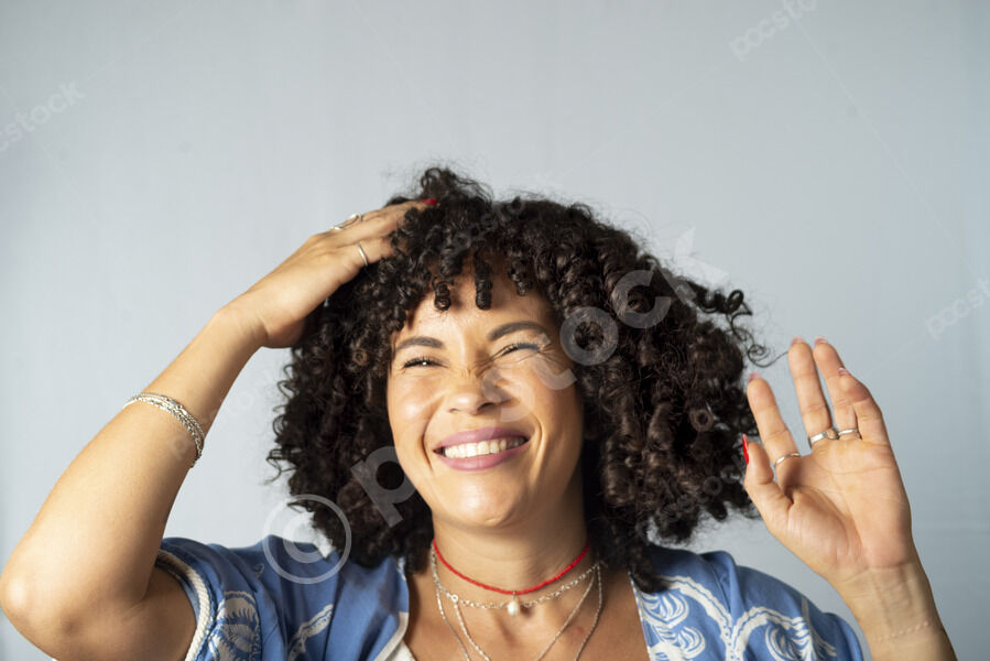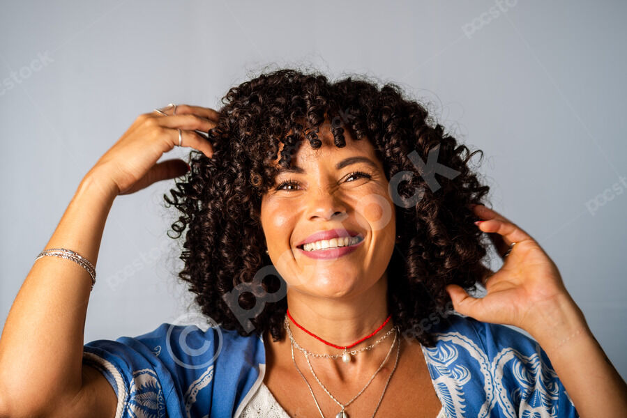 Black woman touching her curly hair and smiling while standing against gray background in studio