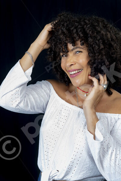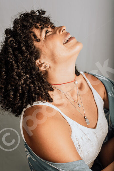 Black woman with curly hair looking up smiling while sitting against light background in studio