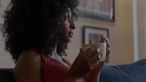 Serious Black woman with curly afro wearing red tank top drinking coffee and looking away thinking while sitting on couch at home