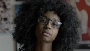 Serious Black woman with curly afro wearing eyeglasses standing indoors