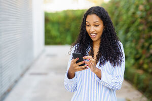 Mixed-race woman with curly hair using smartphone standing on street near roller shutter during daytime