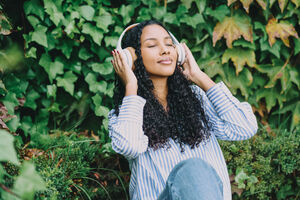 Mixed-race woman with closed eyes putting on headphones sitting on bench in front of wall covered with lush green plants outdoors during daytime