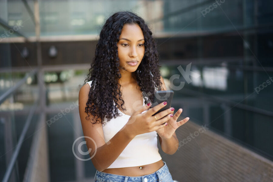 Mixed-race woman with curly hair wearing white top using smartphone while standing outdoors