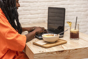 Black woman with braided hair wearing orange shirt working on laptop sitting at table with bowl of healthy food in cafe