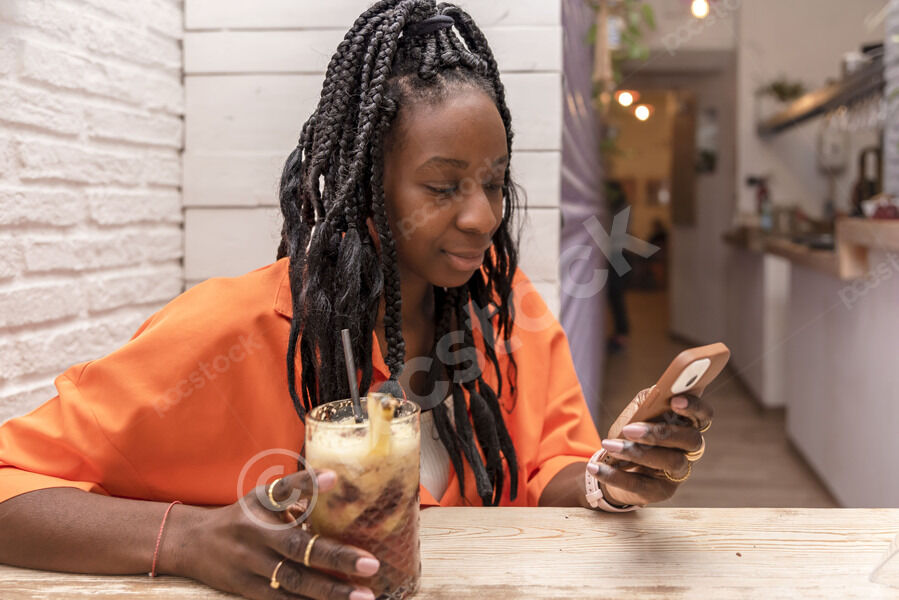 Black woman with braided hair wearing orange polo shirt using smartphone holding glass of juice sitting at table in cafe