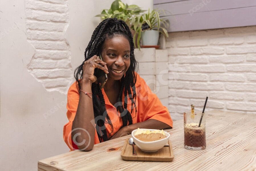 Black woman with braided hair wearing orange shirt looking away talking on smartphone sitting at table with glass of juice and bowl of healthy food in cafe