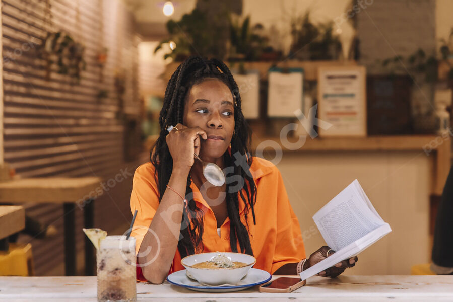 Thoughtful Black woman with braided hair wearing orange shirt looking away holding spoon near cheek eating bowl of healthy food and reading book sitting at table in cafe