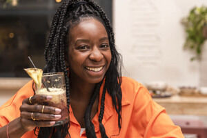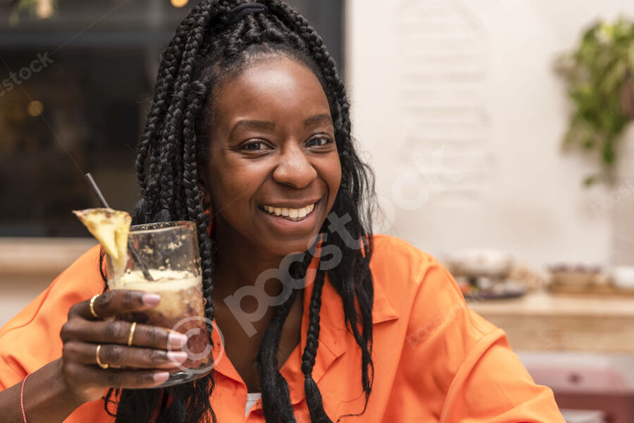 Black woman with braided hair wearing orange polo shirt holding glass of juice sitting at table in cafe
