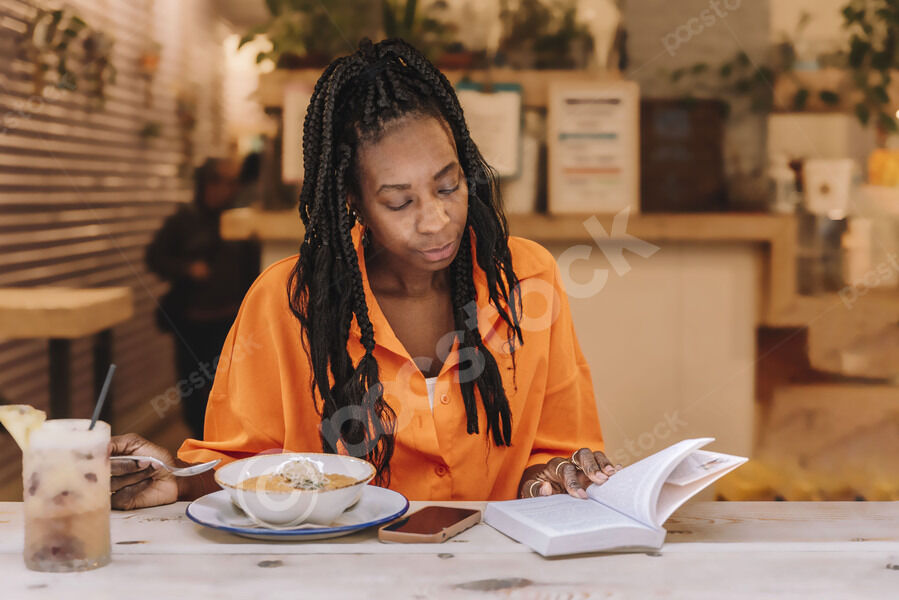 Cropped image of Black woman with braided hair wearing orange shirt reading book while sitting at table with bowl of healthy food in cafe