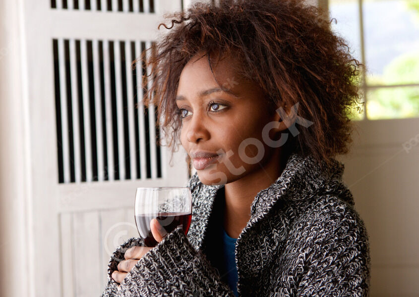 Black woman with afro hairstyle looking away holding glass of wine sitting at home
