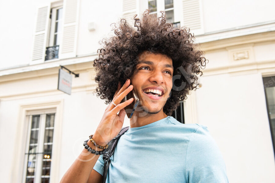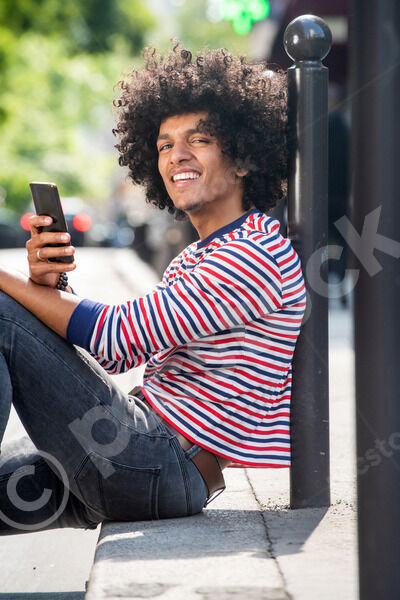 Smiling African American man using smartphone walking with suitcase on crosswalk