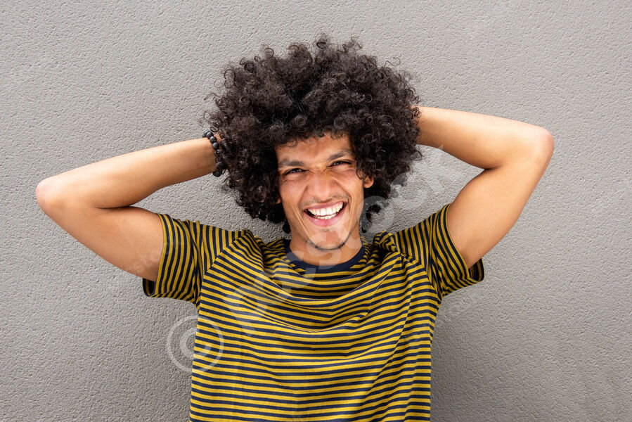 Cheerful African American man with earphones holding smartphone dancing against white wall