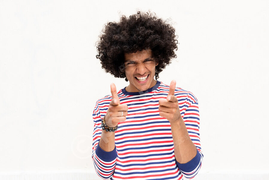 Smiling African American man holding smartphone pointing finger standing against white wall