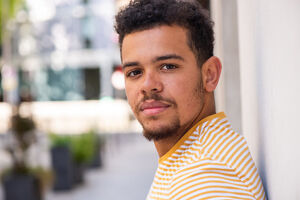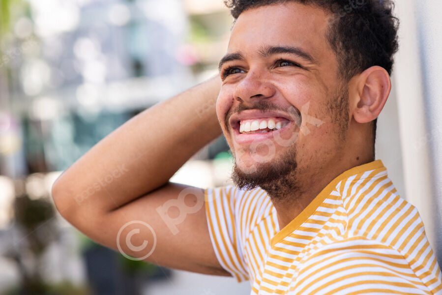 Smiling Black man with hands in pockets standing with one foot up against wall