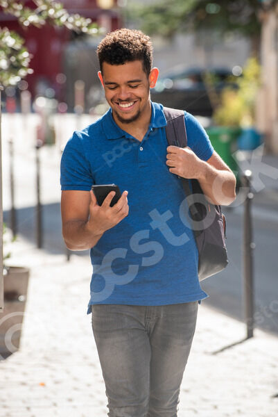 Smiling Black man wearing headphones on neck and using smartphone walking with backpack along city street during daytime