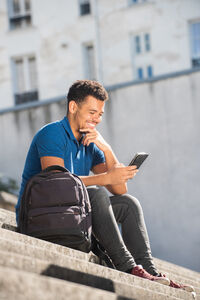 Smiling Black man using smartphone sitting on stairs in city during daytime