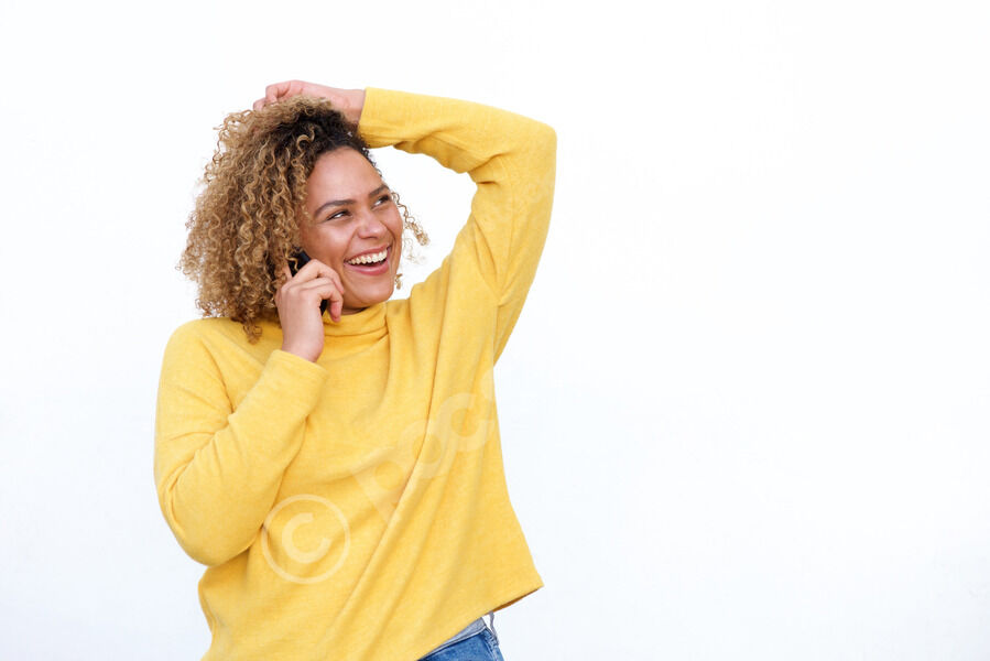 Smiling African American woman with afro hair having phone call looking away walking on street during daytime