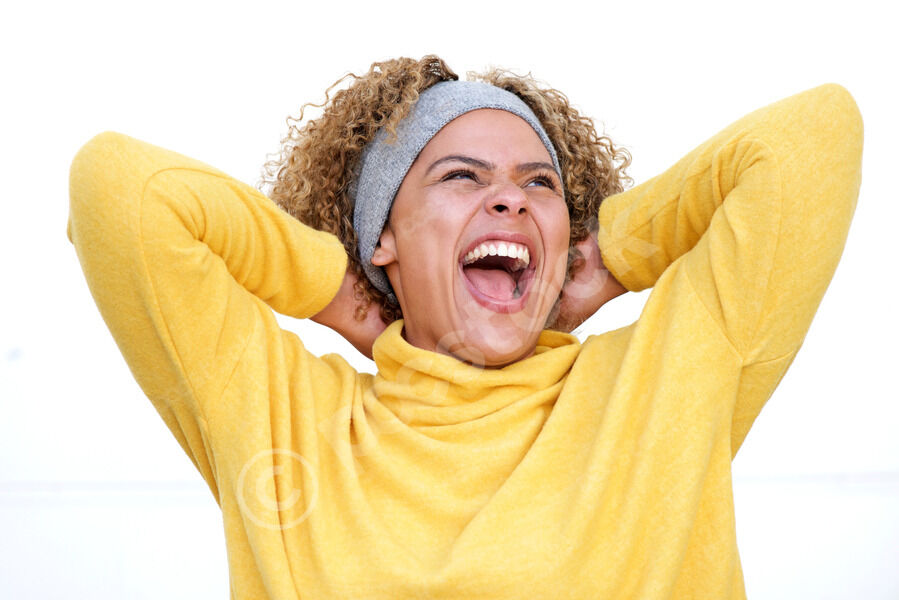 Cheerful African American woman with afro hair standing with hands on hips looking sideways against white wall