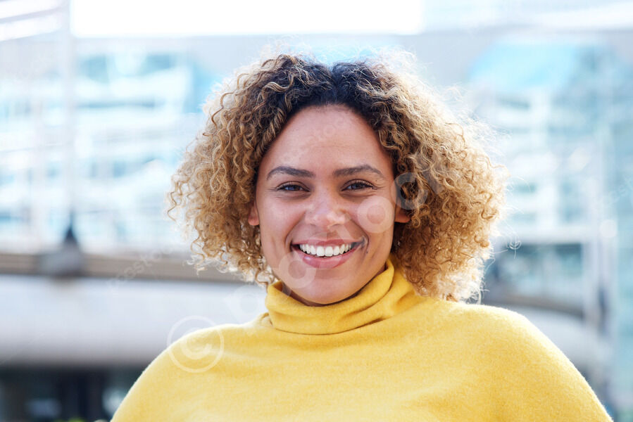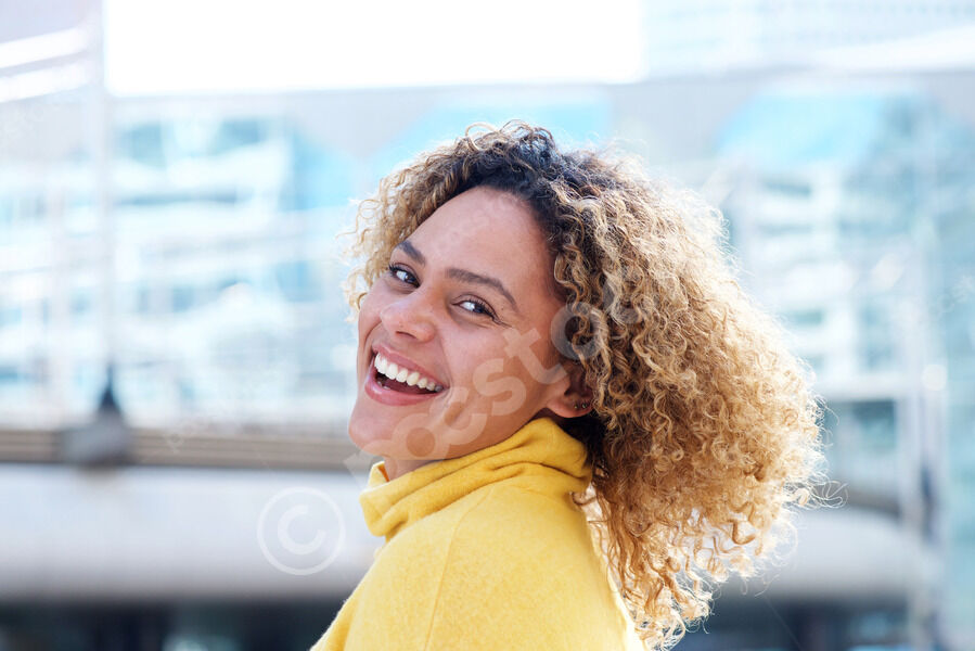 Smiling African American woman with afro hair leaning against white wall on street during daytime