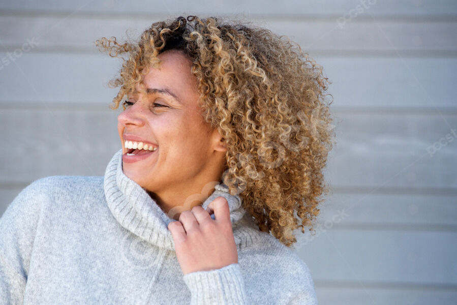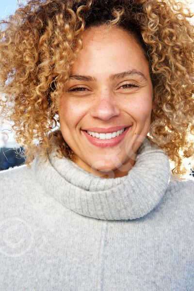 Cheerful African American woman at the beach on sunny day with hand on hair