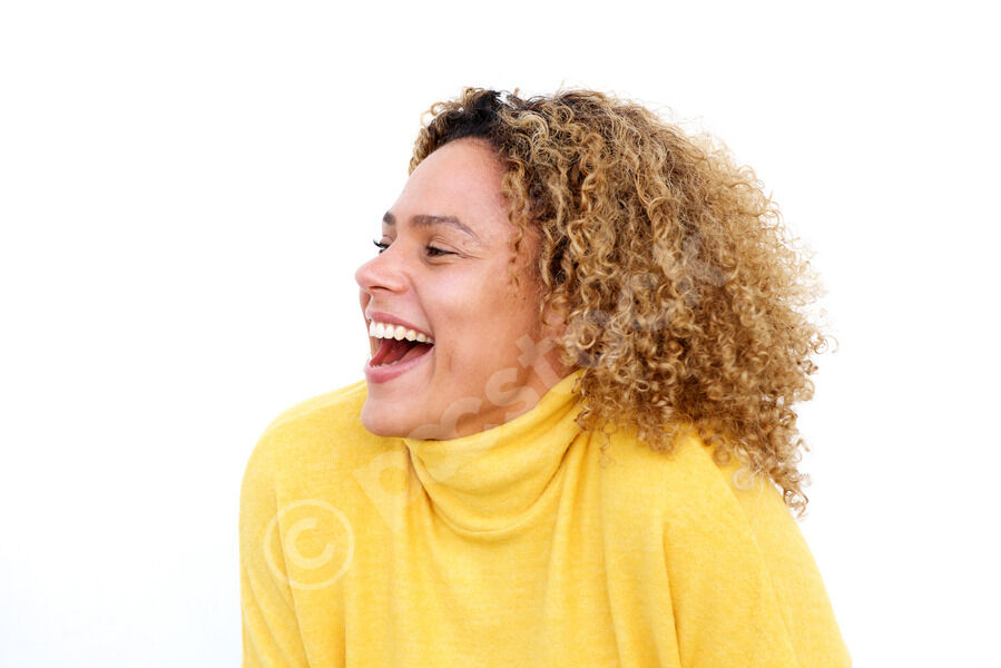Cheerful African American woman against white background with arms behind head