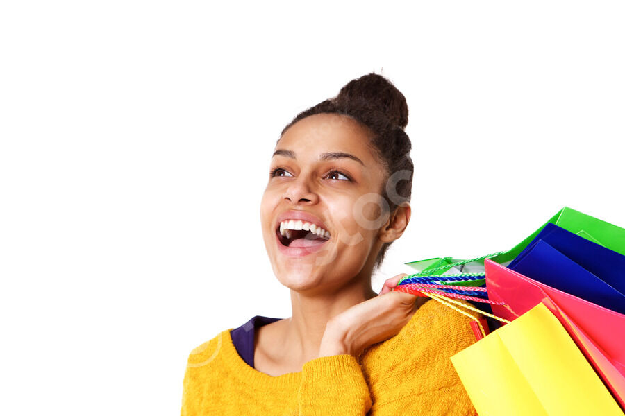 Cheerful African American woman looking away standing with shopping bags over shoulder against white background