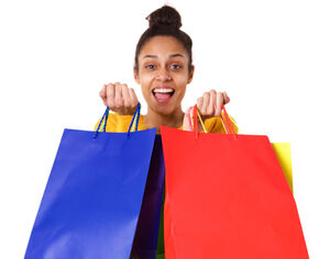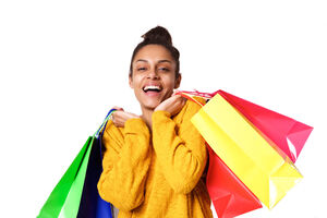 Smiling African American woman standing with shopping bags over shoulder against white background
