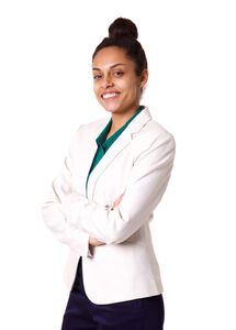 Smiling African American woman standing with hands on head and crossed legs against white background
