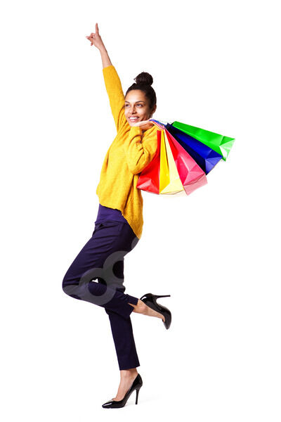 Smiling African American woman pointing finger up standing with shopping bags over shoulder against white background