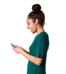 Smiling African American woman holding smartphone looking away standing with hand in pocket against white background