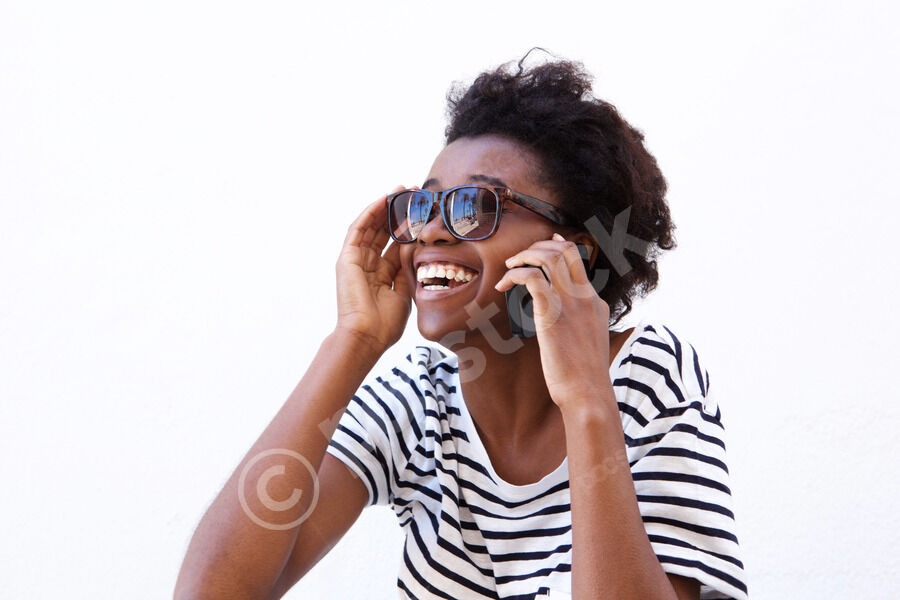 Smiling Black woman having phone conversation sitting outdoors against white background