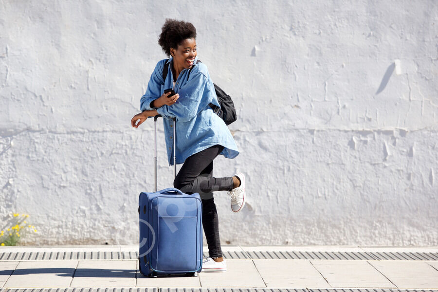 Smiling Black woman looking over shoulder holding smartphone leaning on luggage outdoors on sunny day