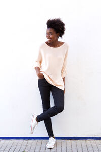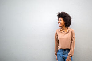 African American woman with thumbs in belt loop standing against gray wall outdoors on sunny day