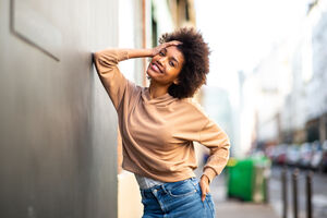 African American woman with hand behind head standing against gray wall outdoors on sunny day