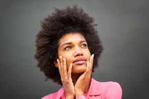 Black woman touching hoodie and hair looking up standing against gray wall