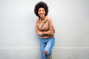 Smiling African American man with crossed arms standing against white wall