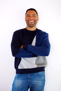 Smiling African American man sitting with elbow leaning on knee outdoors during daytime
