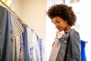 Serious African American male looking away in crouch start position outdoors on sunny day