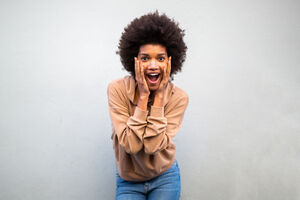 Cheerful African American man laughing with hands behind head sitting on couch at home