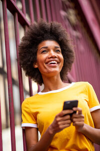 Smiling Black woman holding smartphone looking up standing on city street