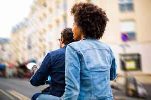 Black woman looking back sitting on scooter as passenger roaming in city