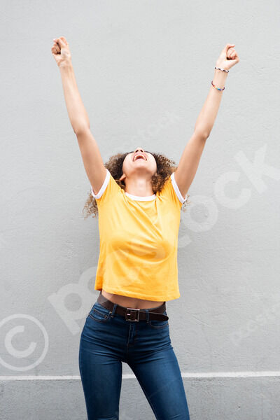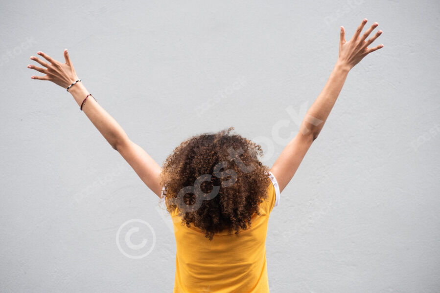 Smiling African American woman showing peace sign with both hands near eyes standing against white background