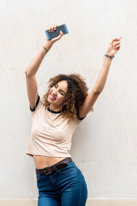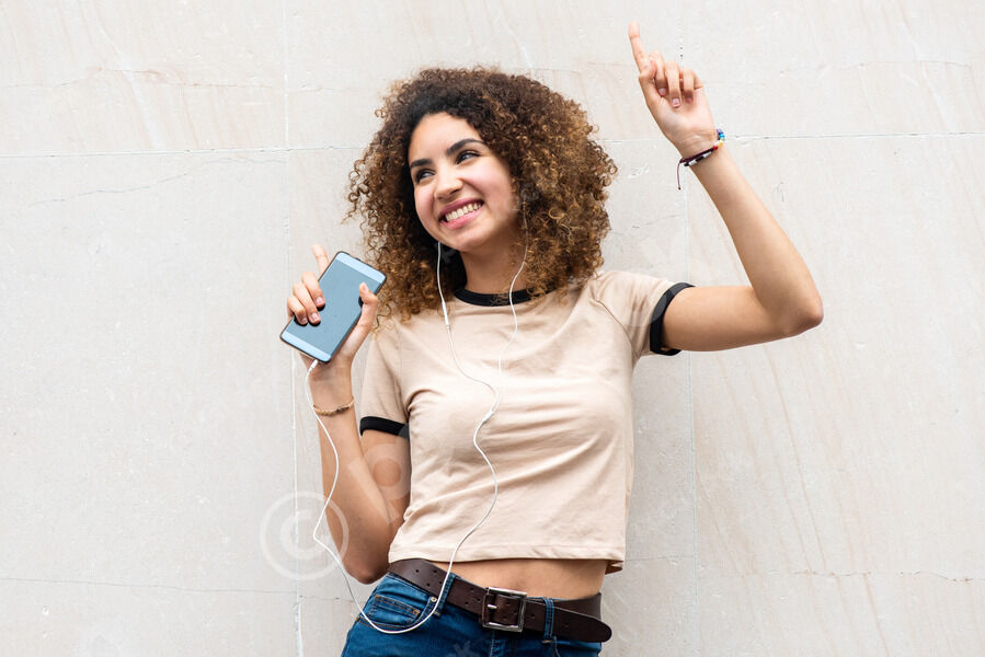 Smiling African American woman in earphones listening to music holding smartphone looking away dancing against white wall