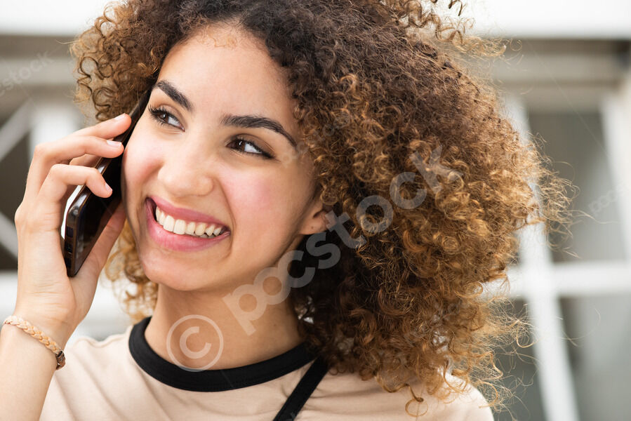 Smiling African American woman having phone call looking away standing on street on sunny day