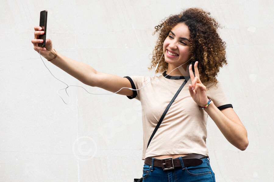 Smiling African American woman in earphones taking selfie showing peace sign gesture standing against white wall