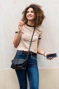 Smiling African American woman in earphones listening to music holding smartphone looking away standing against with white wall on street