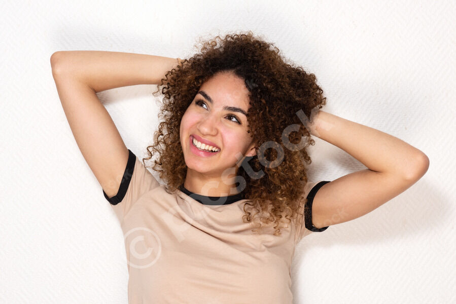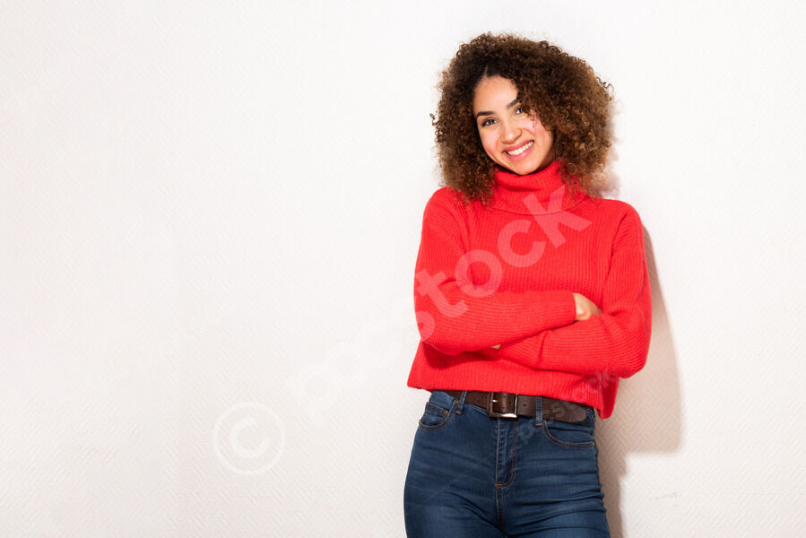Smiling African American woman in earphones listening to music looking away standing with hand behind head against white wall