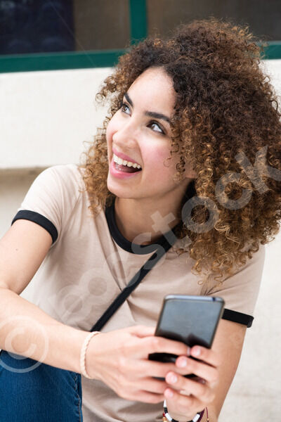 Smiling African American woman holding smartphone looking away sitting on ground on street during daytime