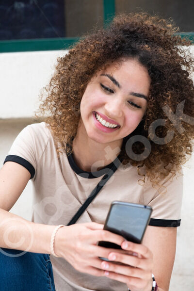 Smiling African American woman using smartphone sitting on ground on street during daytime