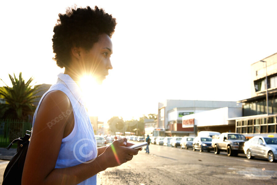 Serious Black woman holding smartphone standing on street on sunny day